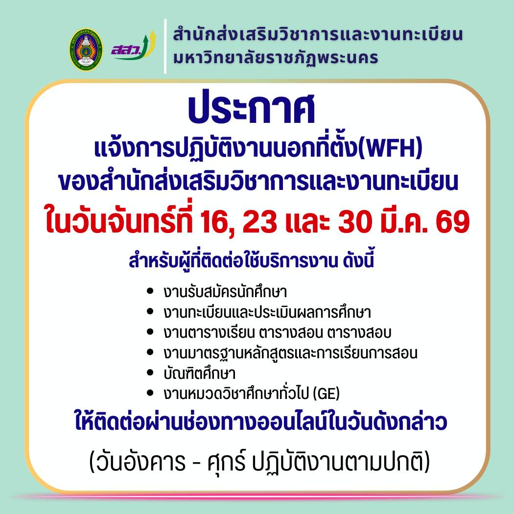 - ประกาศสภามหาวิทยาลัยราชภัฏพระนคร เรื่อง การรับคนพิการเข้าศึกษาในระดับปริญญาตรี ปีการศึกษา 2567