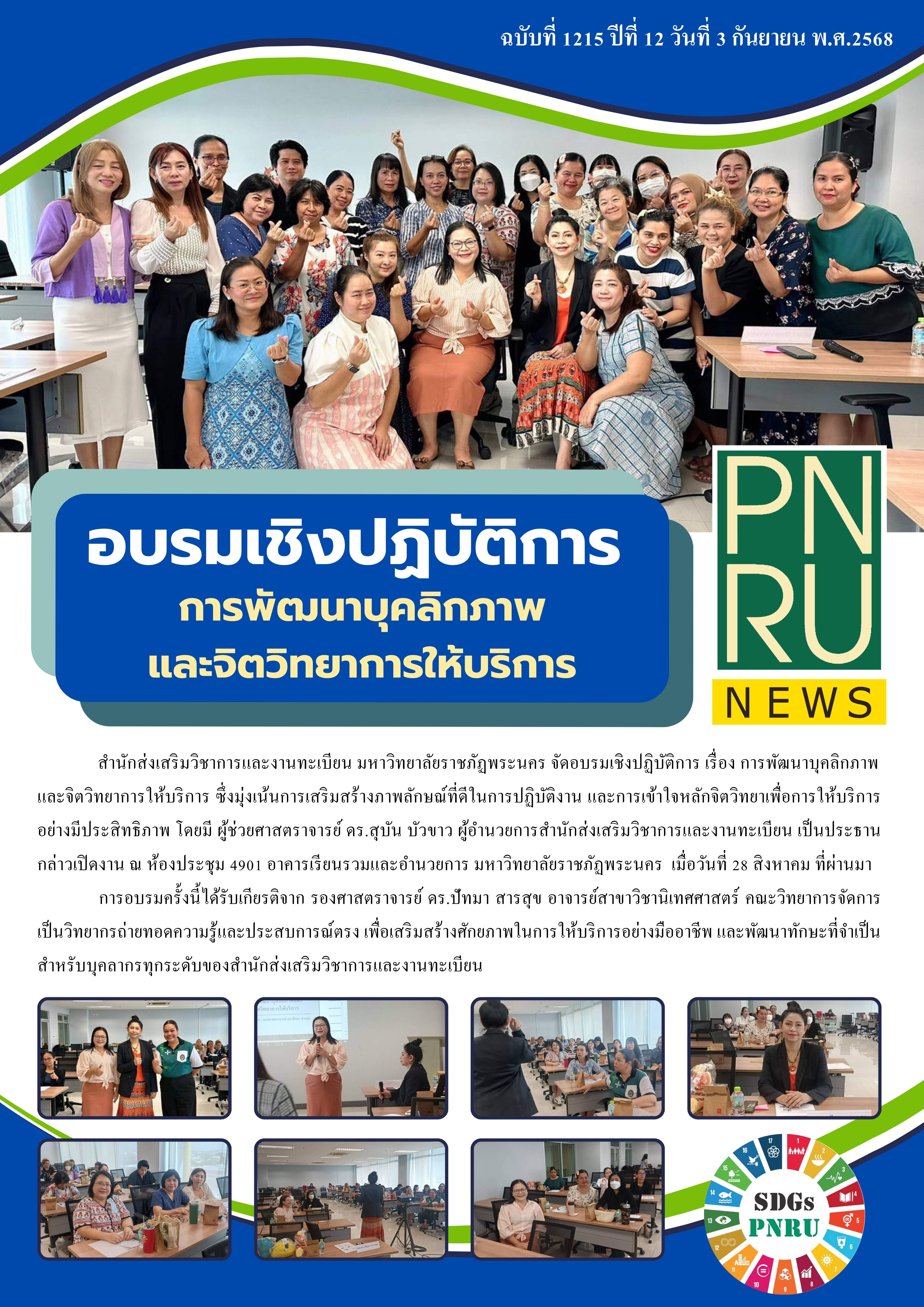 ผู้ช่วยศาสตราจารย์สุบัน บัวขาว ผู้อำนวยการสำนักส่งเสริมและงานทะเบียน มหาวิทยาลัยราชภัฏพระนคร เป็นประธานในพิธีเปิดอบรมเชิงปฏิบัติการ เรื่อง การพัฒนาบุคลิกภาพและจิตวิทยาการให้บริการ เมื่อวันพฤหัสบดีที่ 28 สิงหาคม พ.ศ. 2568 ณ ห้องประชุมชั้น 4 ห้อง 4901